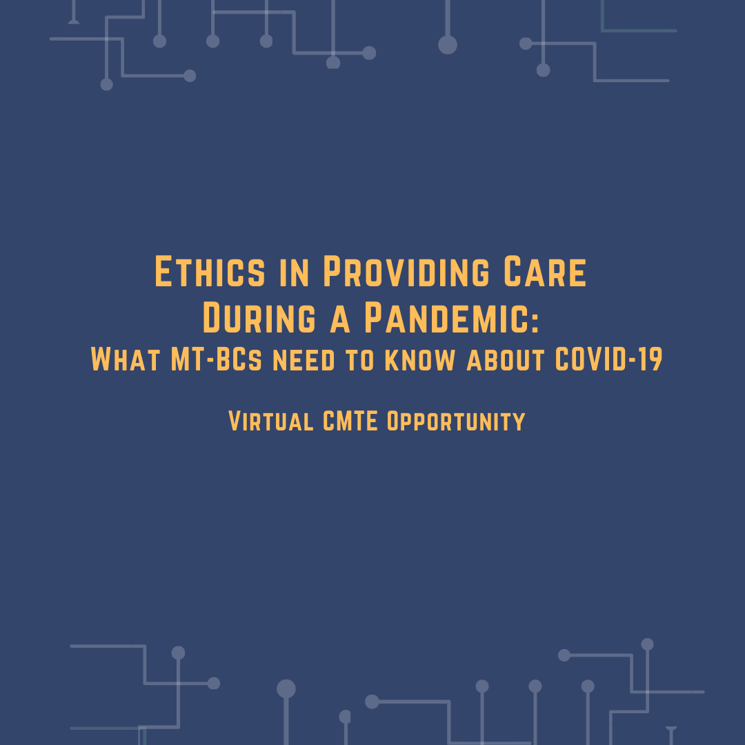 We are facing an unprecedented time with the COVID-19 pandemic. Music therapists are at risk for acquiring the virus, and risking their health and the lives of their loved ones if precautions are not taken. They also risk infecting clients they serve unknowingly due to the asymptomatic incubation period. This course provides information about the pandemic and precautions to take in an effort to prevent infection and further spread of the virus. Ethical dilemmas arise when music therapists are restricted from providing much-needed services to clients. We will explore these ethical dilemmas and suggest ways to advocate through them to maximize patient care safely. Participants will earn 1 Ethics CMTE.